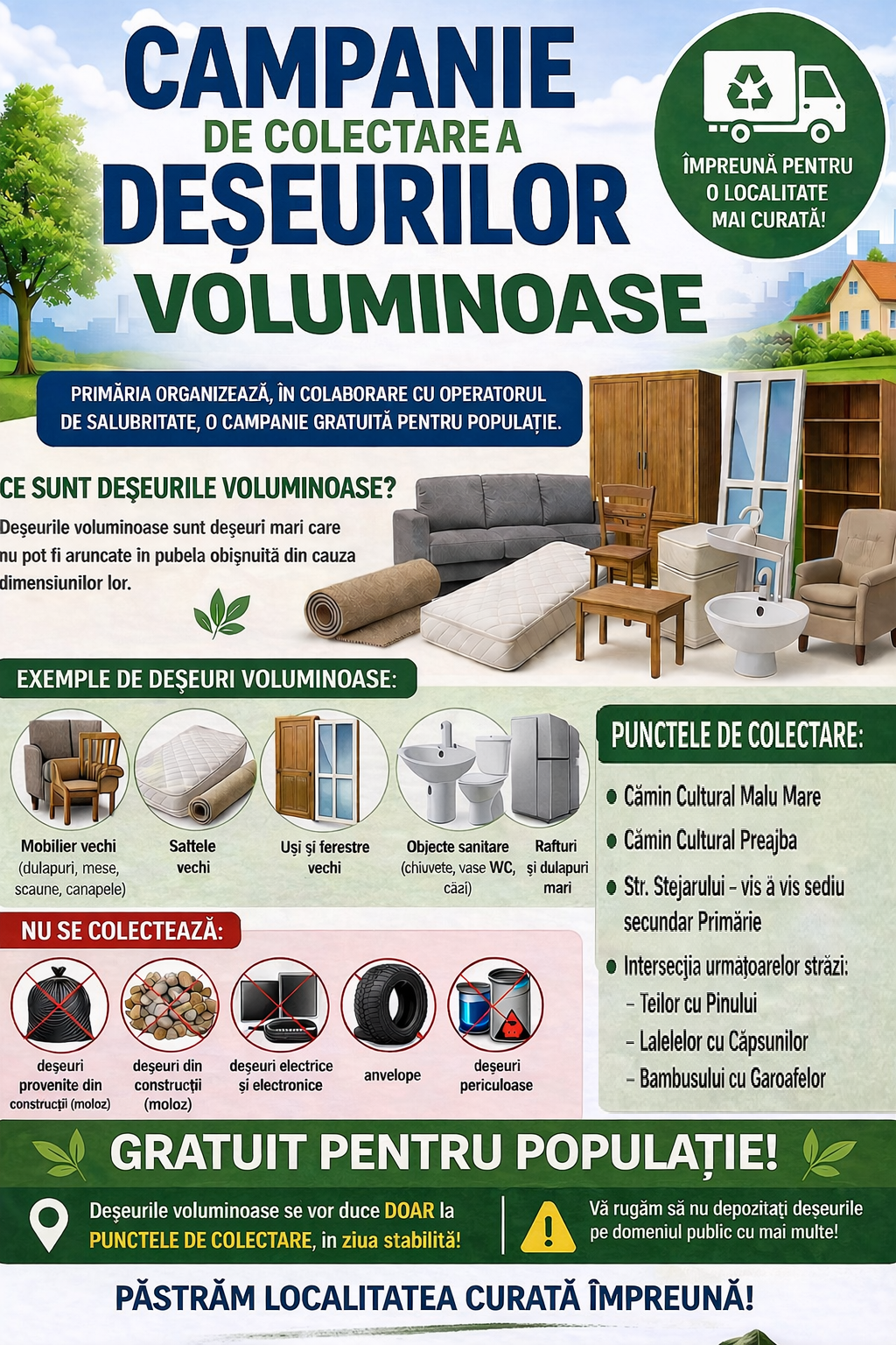 In data de 23.04.2026 se va desfasura campania de colectare a deseurilor voluminoase si anume: - mobilier vechi (dulapuri, mese, scaune, canapele), saltele si covoare, usi si ferestre vechi, obiecte sanitare (chiuvete, vase de WC, cazi, bideuri), oglinzi mari, rafturi si biblioteci, alte obiecte de uz casnic de mari dimensiuni.
